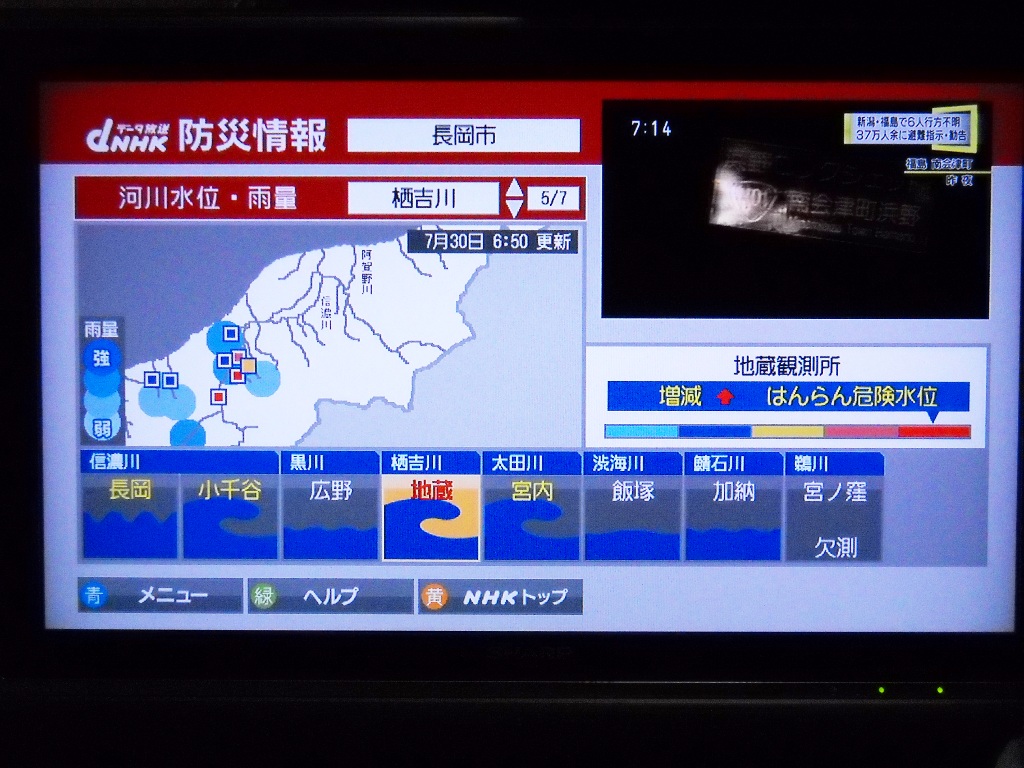 朝の 6:30。地デジのデータ放送で河川の氾濫情報を確認。栖吉川は危険な状態、太田川も危ないらしい。うちはアパートの二階なのでとりあえず冠水はしないだろうが、車が水に浸かるのはやだなあ。栃尾の実家も高台なので大丈夫だろうが、そちらはむしろ大規模な山崩れとか心配。