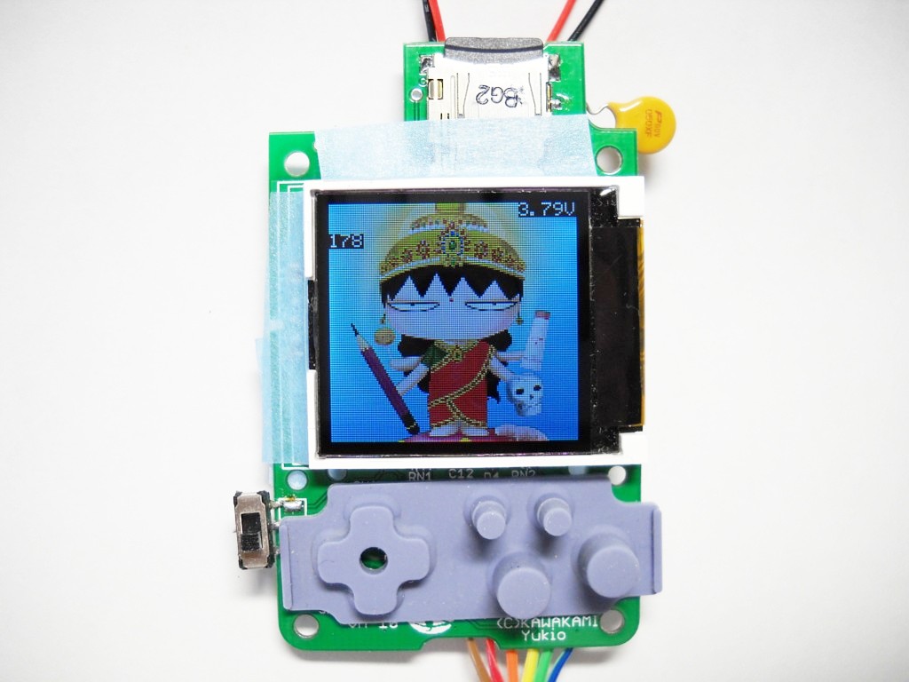 いくつのプロジェクトを並行しているんだかわたしもわけわからんが、こちらは開発中のセガ・ビジュアルメモリのケースに入れる MP3プレーヤー。液晶にべつやく様を表示してみた。横向き表示も特に問題ない。ただ、バックライトが青いなあ。目で見るとこの画像よりはだいぶマシだけど。