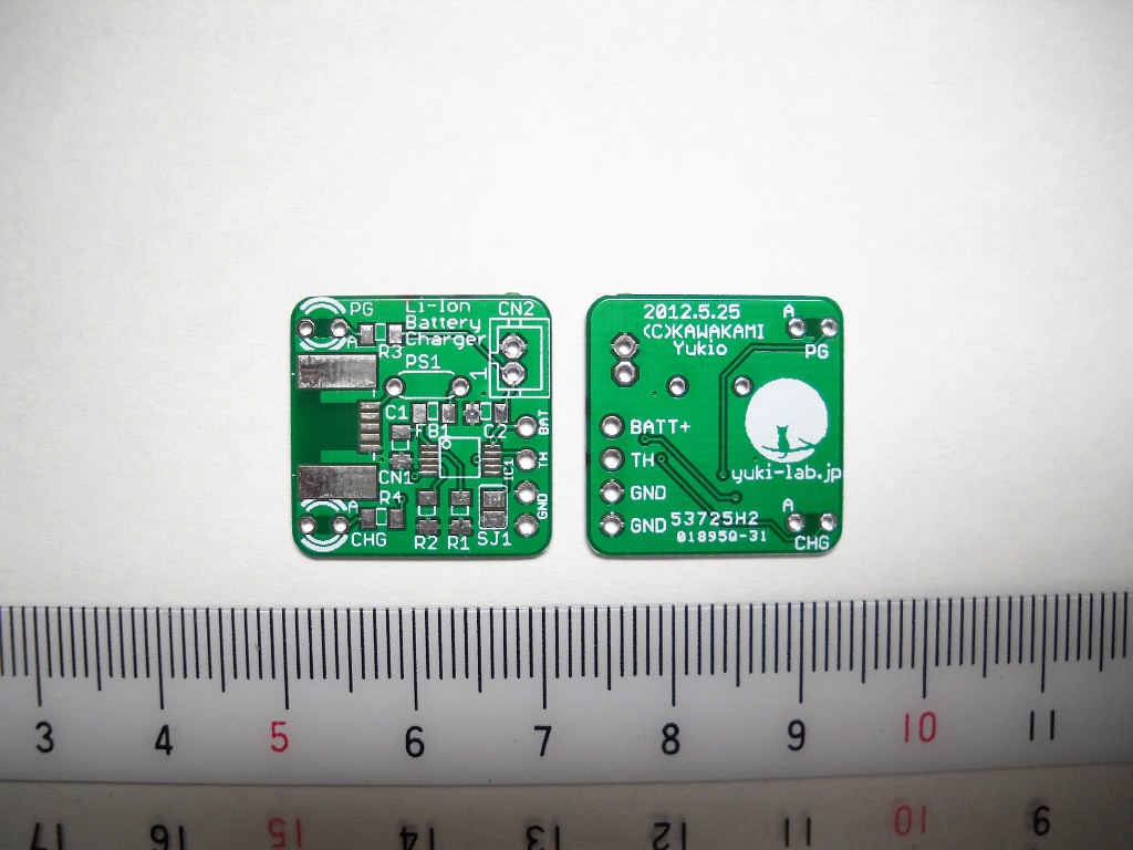 また小さな基板キター。今度のはリチウムイオン電池充電基板。リチウムイオン電池は充電に失敗すると大変なことになるからきちんとした基板を作っておきたかったの。