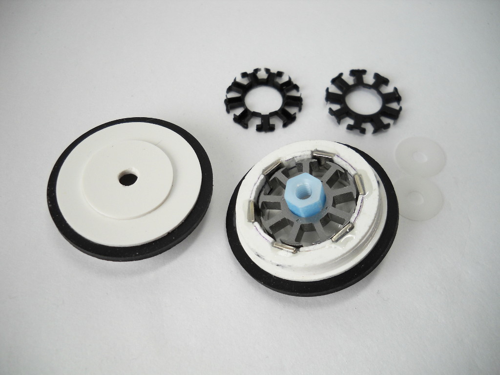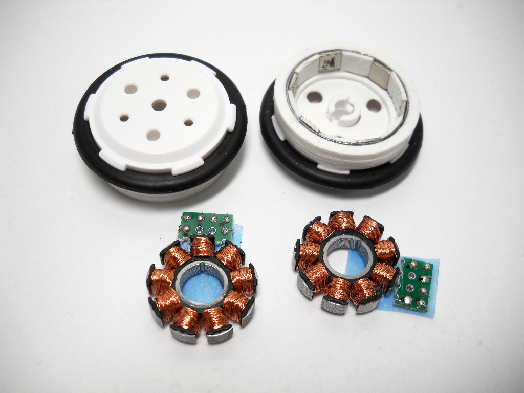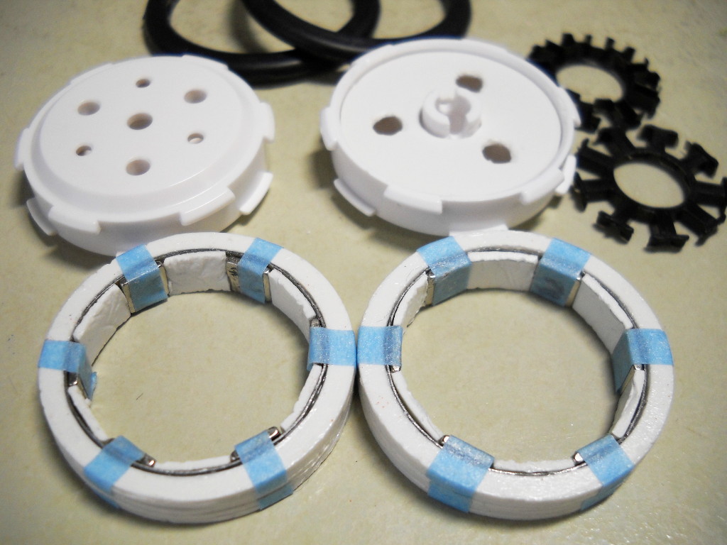右側はモーターのローター部分。内側には前回同様、いなばのタイカレーのフタを切ったのを貼り付けている。この後、内側にネオジム磁石を貼る。こんなのでも閉磁路を構成すると効率が違ってくる。マグネットコーティングとは違うと思う。