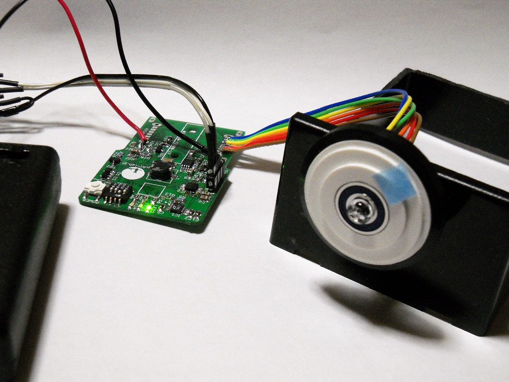 ステッピングモータとしてはトルク不足で安定しないが、普通にブラシレスモータとして動かすのであればなんとかなりそうな気もする。PWMで三相をサイン波駆動したり。この基板ではそういう出力(三相別々のデューティ比)はできないので作りなおすかなあ。外側のロータも樹脂加工屋さんに作ってもらったりして。