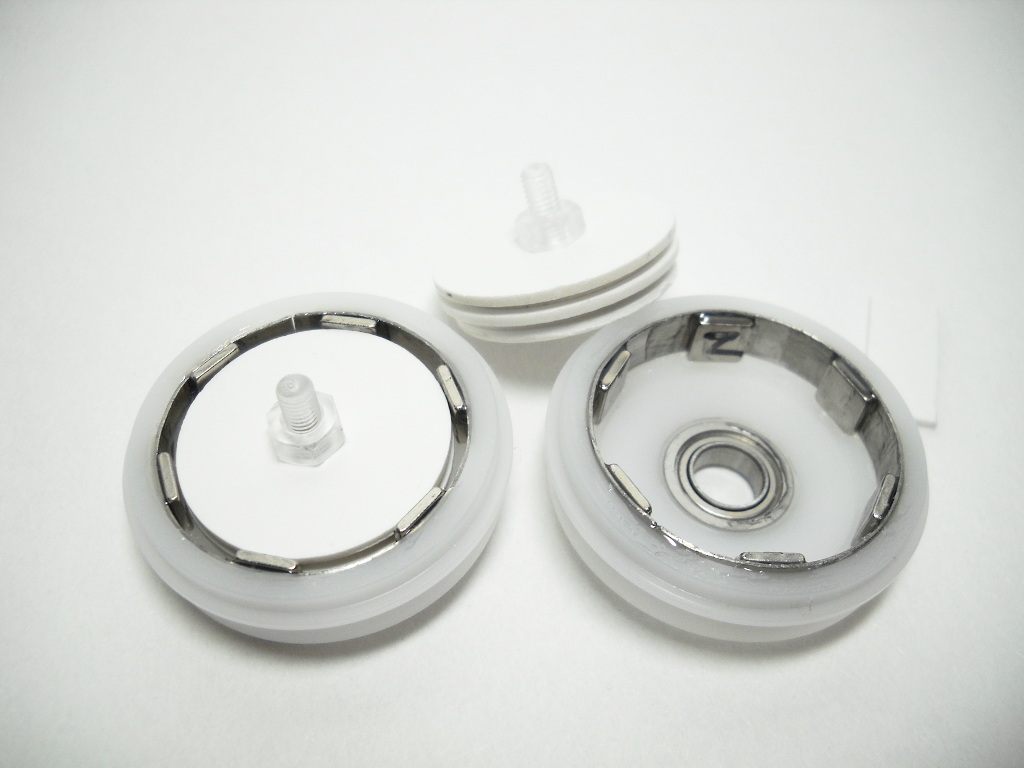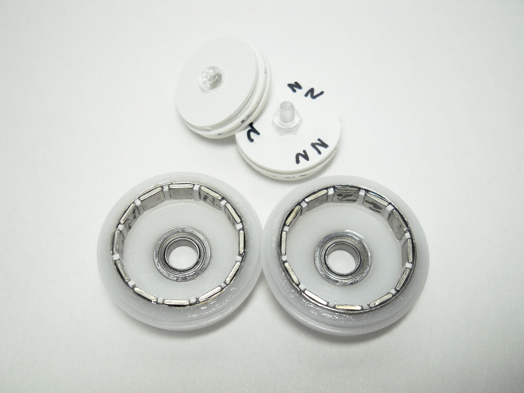 なので固定具を作ってやってみた。最初に1個おきに磁極を交互にして貼り付ける。交互にするとお互いに引き合いつつも安定しているので作りやすい。その後、固定具を入れて間に同じ向きの磁石を入れていく。このやり方でなんとかなった。