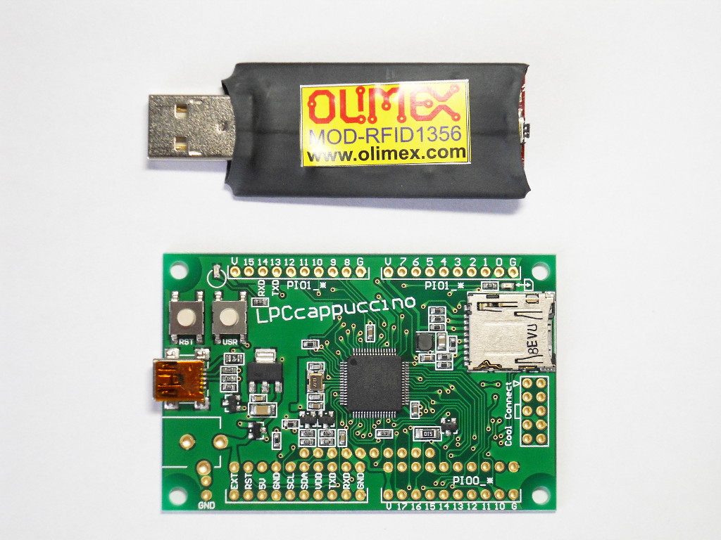 Strawberry Linuxで買った USB RFIDリーダと LPCcappuccinoが届いた。LPCcappuccinoの方はすぐに何か作る予定は無いけど、STM32だけじゃなくて LPCの方もいじっておこうと思った為。コネクタがハンダづけされていないのは初心者にはハードルが高いかもしれないけど、わたしにとっては狭いケースに組み込める余地があるので助かる。RFIDリーダの方は「読み込みのみ」とされているけど、書き込みもできると踏んでいる。今週末当たり実験するつもり。既に書き込み可能な RFIDタグも買ってあるし。