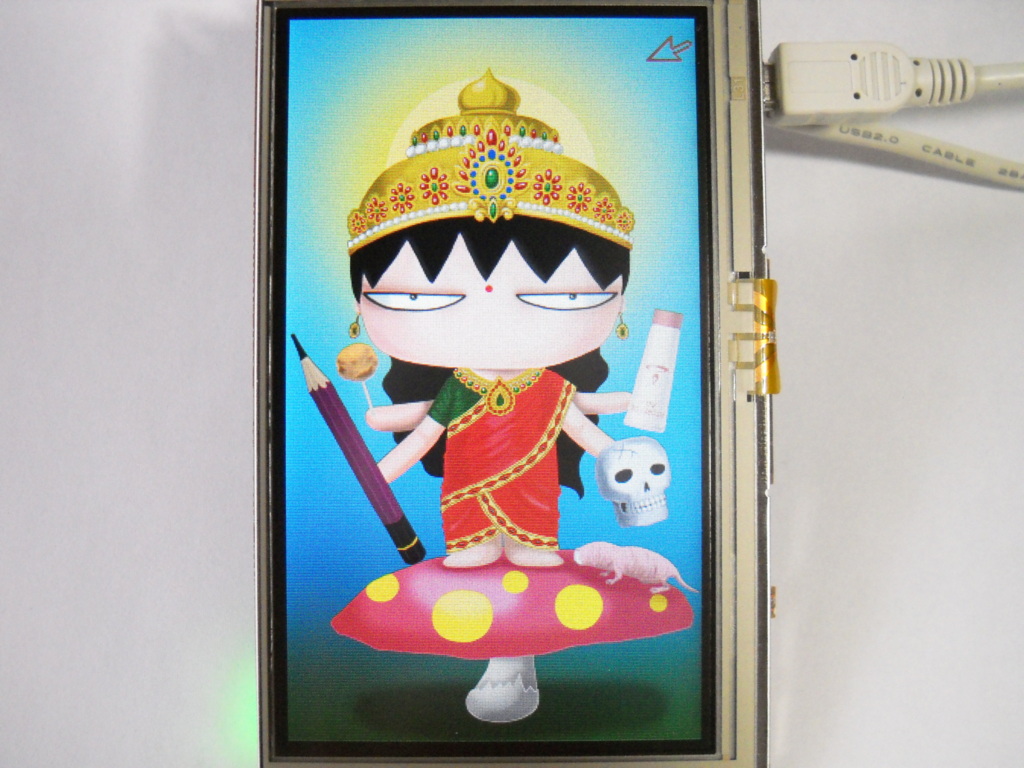 OLIMEX MOD-LCD4.3の動作テスト。いつも通りべつやく様を表示してみた。ソフトウェアは購入時のままのテスト用。USB-TTLシリアルコンバータ(3.3V)の変換コネクタを作って UEXTコネクタとつなぐ。TXDと RXDはクロスさせること。シリアル端末ソフトで 115200bpsを指定するとコマンドのやりとりができる。また、電源を兼ねた USBでパソコンにつなぐとマスストレージで認識されて microSDの内容がパソコンから見える。そこに表示したい BMPファイルをコピーし、端末ソフトで DISPLAYコマンドを発行してやれば表示される。べつやく様右上の矢印はカーソルで、タッチパネルに触れるとそこに移動する。また、シリアル端末に座標が出力される。