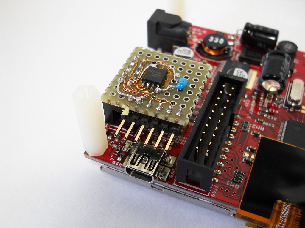 OLIMEX MOD-LCD4.3で日本語フォント表示。UEXTコネクタに 32Mbit(4MB)のシリアルフラッシュROMを増設。そこに日本語フォントを入れて文字表示してみた。MOD-LCD4.3は RAMが 32MBもあるから microSDカードからフォントデータを全て RAMに読み込んで表示してもいいけど、やはりフォントは内蔵しているのが望ましい。
