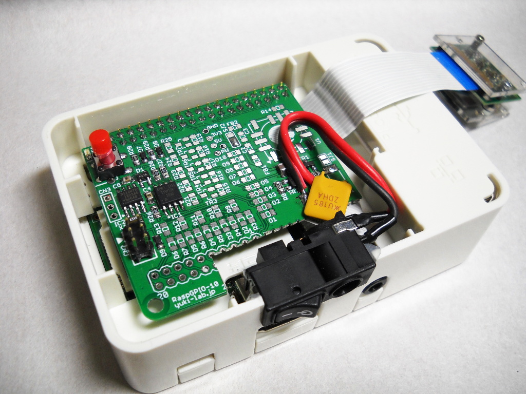 そんなわけで Raspberry Pi 2(B+)用の GPIO拡張・電源・RTC基板。手前が切り欠いてあるのは電源コネクタを追加済みのケースに無理やり入れる為。このケースでは特に GPIOを使わないのでそのあたりの部品は未実装。裏面に RTCバックアップ用のコイン電池もついてます。