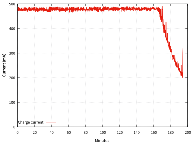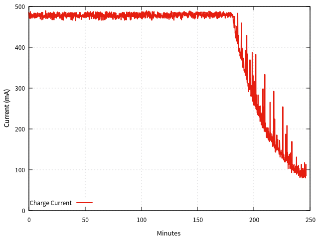 g06の充電(USB 0.5Aモード)、ログをグラフ化してみた。250mA以下になったら切れば良さそう。というか、ひょっとすると電池としてはフル充電の手前で「充電完了」としているような気もする。
