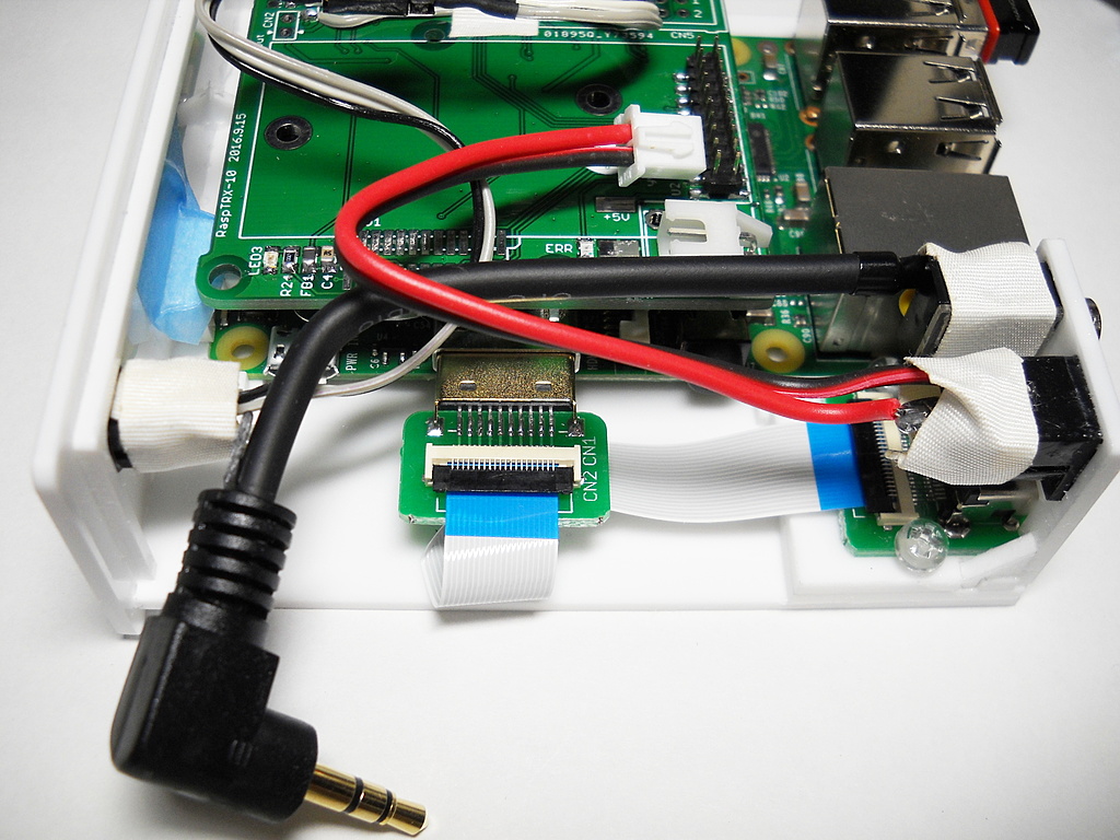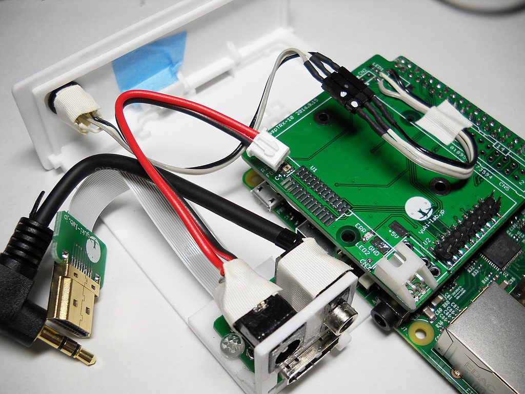 Raspberry Piケース、内部の画像追加。HDMIは延長ケーブルを切って被覆を剥き、手ハンダ用HDMIコネクタにつないでいる。今回はこれで済ませたけど、美しくないので次回は基板を作って対処する予定。