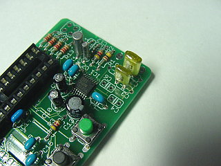 単体の青色 3mm LEDを取り付けます。左の画像では拡散用キャップをつけていませんが、基板にハンダづけした後ではつけにくくなりますので、あらかじめつけてからハンダづけした方がいいと思います。またそうしておけば青色と緑色の LEDの区別もつきますし。
