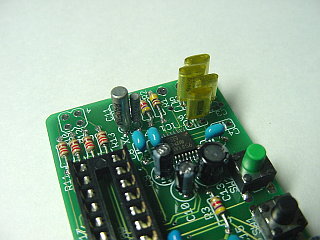 C2, C3のコンデンサの足の幅が狭い場合はやはり左の画像のように IC1側の穴に足を入れてハンダづけしてください。足の幅が広い時は普通に両端の穴に入れてください。