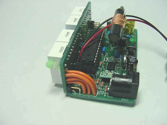 問題なければ 3.3Vの ACアダプタをつないでみます。初めて電源を入れた時は 7SEG LEDは何も点灯せず、緑色の LEDだけが点滅します。正常に電波を受信できている場合は標準電波のタイムコードに従って1秒ごとに点滅し、2、3分後に正確な時間が表示されます。