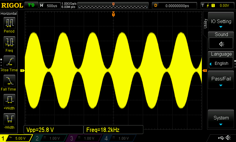 1kHz変調波形。消費電力を抑える方向で調整をしたら波形のピークがちょっと丸まりましたが、音質的には支障ないレベルかと。