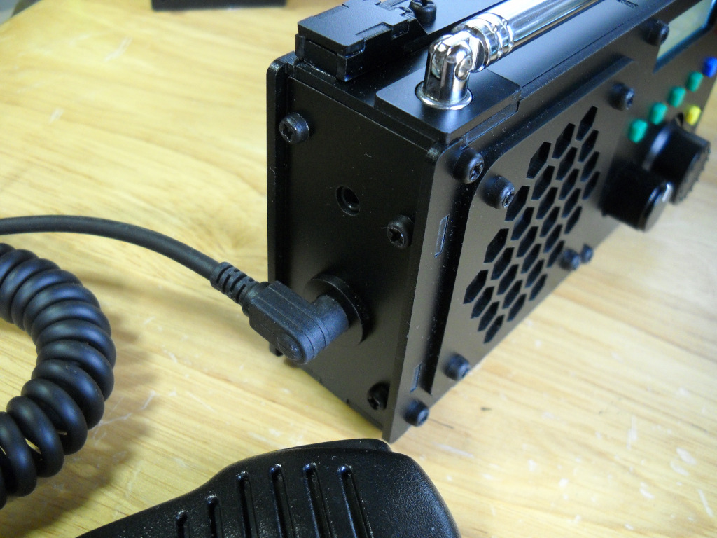 ボディ左側。上の穴はヘッドフォン端子で、下がマイクコネクタ。マイクは八重洲のΦ3.5mm 4Pタイプ互換の物を使います。このマイクはスピーカーマイクなのですが、このコネクタにはスピーカー出力は出ません。これは基板が受信部と送信部に分かれている為。いろいろ切り替えるのも面倒だったので。