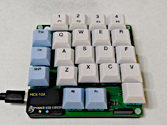 こちらは試作初号機のキーキャップを透明なカバー付きのものに変えてみたところ。間に紙を入れられるのでプリンタで印刷すれば表示を自由にカスタマイズできる。買ってみてわかったが、キーボード自作界隈ではあまり見ない(たぶん)のはタッチタイプがしにくくなるからと思われる。カバーはアクリル製と思うが、指が滑りにくいのだ。タッチタイプをする時は指はホームポジションに置いていて、そこから離れたキーを押す時は指を移動する必要があるわけだが、その時にスムーズに滑ってくれないと打ちにくい。普通のキーキャップはその辺にも気を使ってる。aitendoのキーキャップも安い割にちゃんと梨地になっているし。