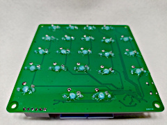 キースイッチはプリント基板にハンダづけしているだけじゃなくて裏面からホットボンドで固定してある。これだけでだいぶ安定感が違う。ちなみにうちのプリント基板、中央の丸穴はデータシートで指定されたΦ4mmではなくて少し小さいΦ3.8mmにしてしてきっちりはまるようになっている。