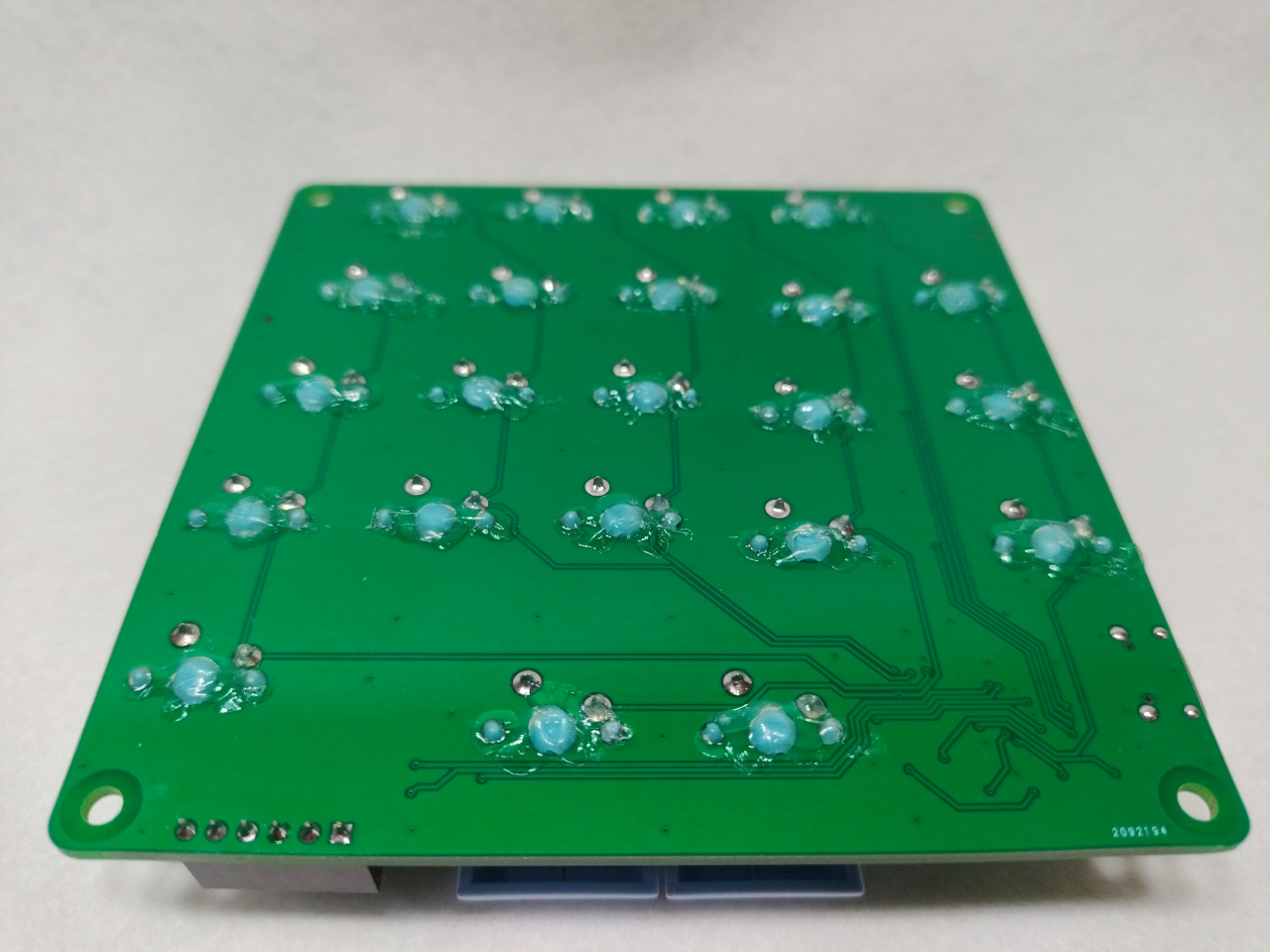 基板裏面。キースイッチはハンダづけだけでなく、ホットボンドでも固定してあります。